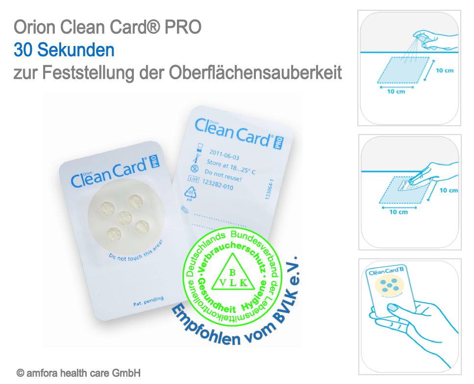 Clean Card® PROРекомендуется Bundesverband der Lebensmittelkontrolleure eV (Федеральная ассоциация пищевых инспекторов) и многими аудиторами для внутренней проверки правильности очистки. В течение 30 секунд Clean Card® PRO показывает, что не видно невооруженным глазом. Все белоксодержащие загрязнители, а также остатки поверхностно-активных веществ от остатков моющих и дезинфицирующих средств на оптически чистых поверхностях являются идеальной питательной средой для роста микробов.
